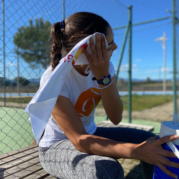 Toallas de microfibra 190 gr. Acabado overlock. Goma de cierre. Color blanco. Logo de la Academia diseñado simulando bandera de España. Tamaño toalla: 30×50 cm.